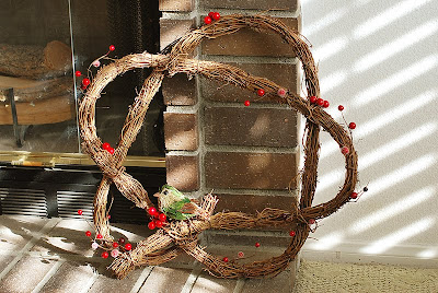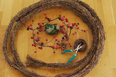 Bundled twigs/sticks. I purchased mine at Michaels. I believe they are available at Joanns too. You could bundle twigs yourself; however, I imagine this would be quite time consuming. Though, on the other hand, you may be an amazing twig bundler and in this case my imagining would be wrong.- Berry garland - also at Michaels, or any craft store.